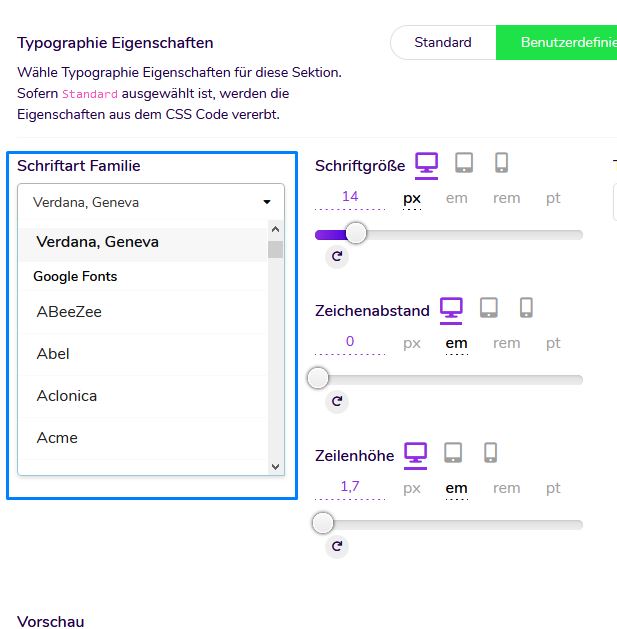 Spielen Sie mit mehr als 998 Google Fonts, die in den Abschnitt Typography integriert sind.